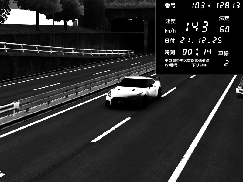 | 2025/12/21 00:35 | 4号下り 代々木 | 163 / 60 km/h | Nissan GT-R NISMO 2017 | CAPTURE |