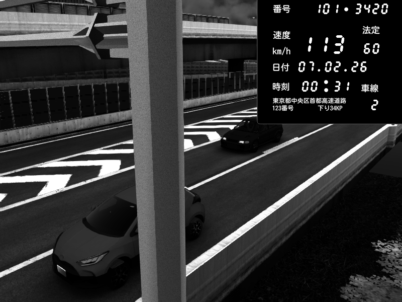 | 2026/02/07 00:31 | C1内回り 竹橋JCT | 113 / 60 km/h | Mitsubishi Lancer Evolution V Wangan Spec | CAPTURE |