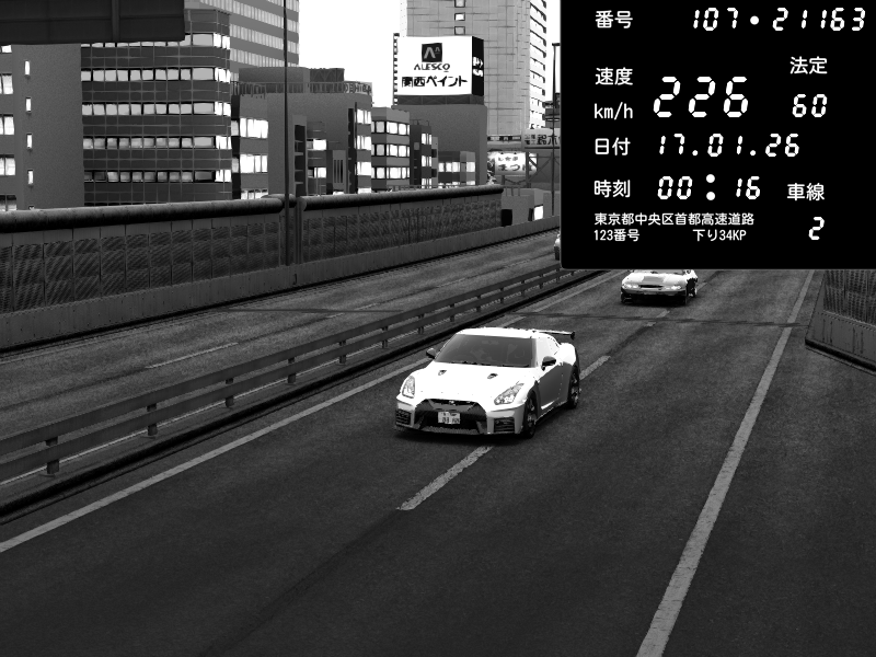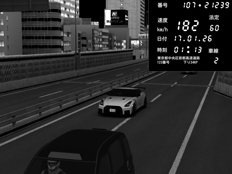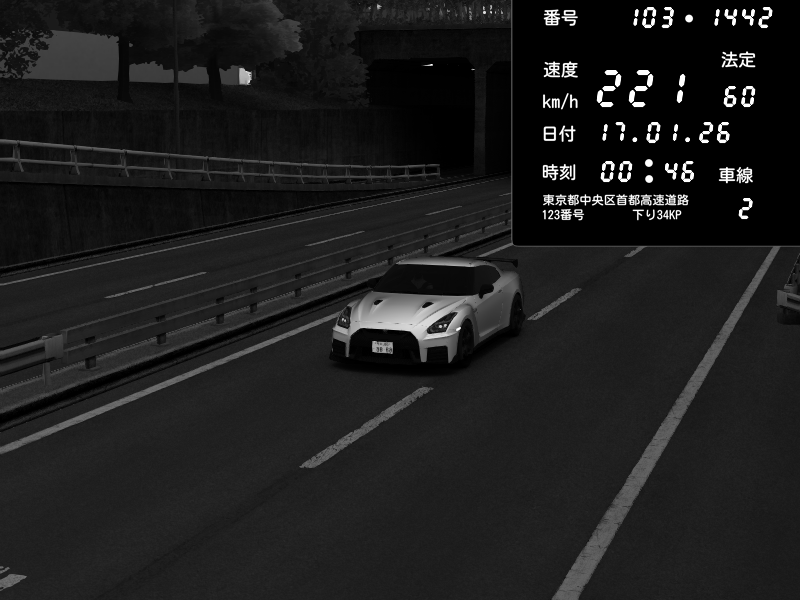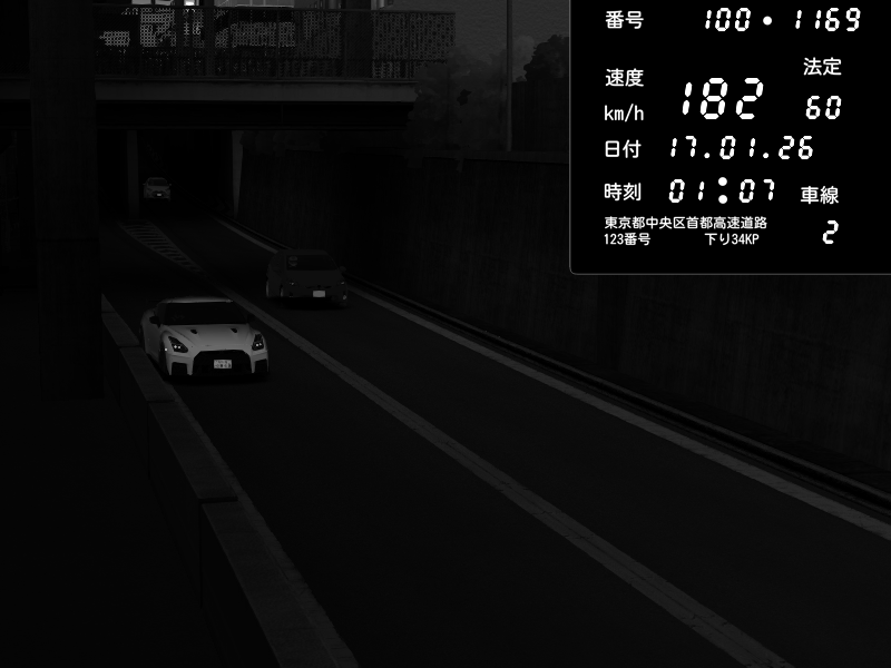 | 2026/01/17 01:07 | C1内回り 京橋 | 182 / 60 km/h | Nissan GT-R NISMO 2017 | CAPTURE |