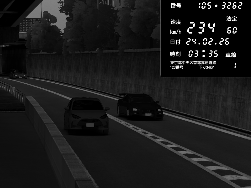 | 2026/02/24 03:35 | C1外回り 新富町 | 147 / 60 km/h | Nissan Skyline GT-R R34 Nismo Omori Factory S1 | CAPTURE |
