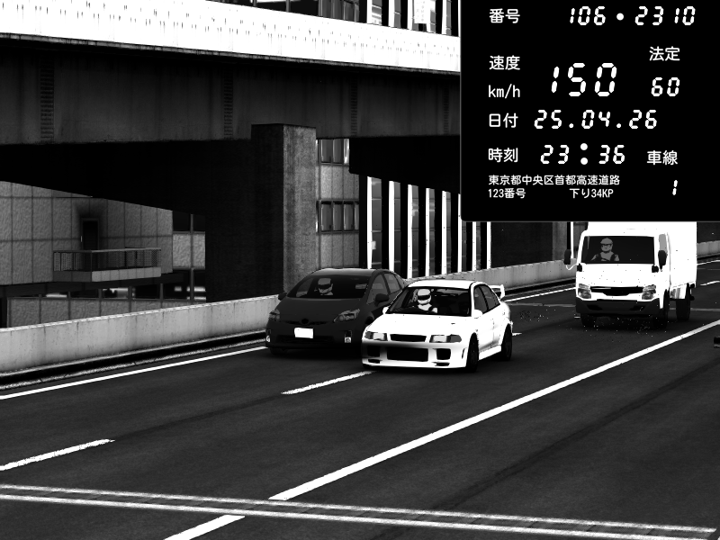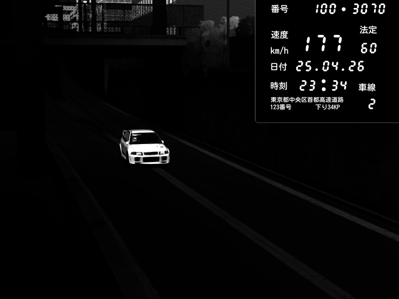 | 2026/04/25 23:34 | C1内回り 京橋 | 177 / 60 km/h | Mitsubishi Lancer Evolution V Wangan Spec | CAPTURE |