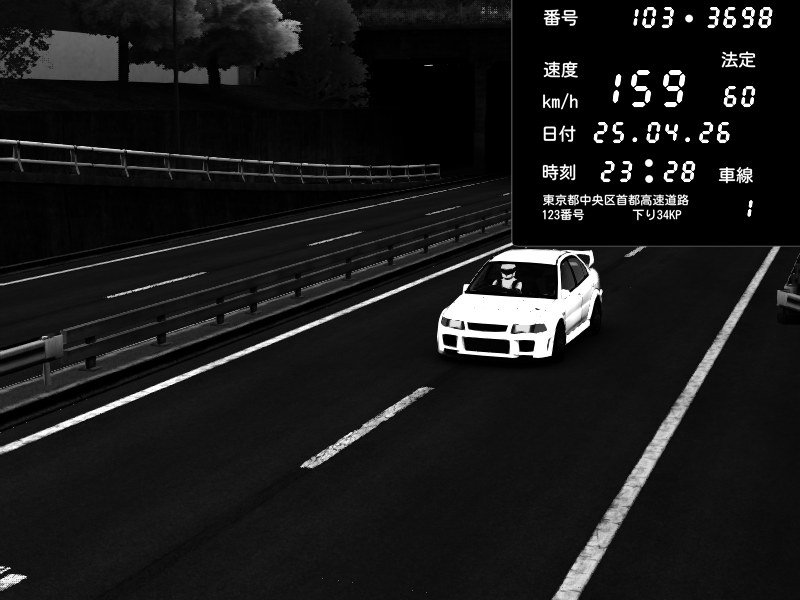 | 2026/04/25 23:28 | C1内回り 銀座 | 159 / 60 km/h | Mitsubishi Lancer Evolution V Wangan Spec | CAPTURE |
