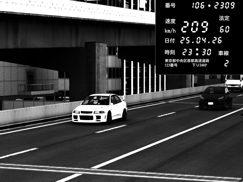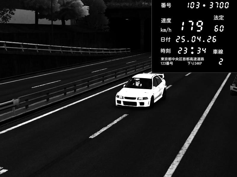 | 2026/04/25 23:29 | C1内回り 京橋 | 128 / 60 km/h | Mitsubishi Lancer Evolution V Wangan Spec | CAPTURE |