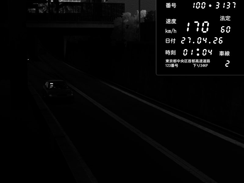 | 2026/04/27 01:04 | C1内回り 京橋 | 170 / 60 km/h | Mitsubishi Lancer Evolution V Wangan Spec | CAPTURE |