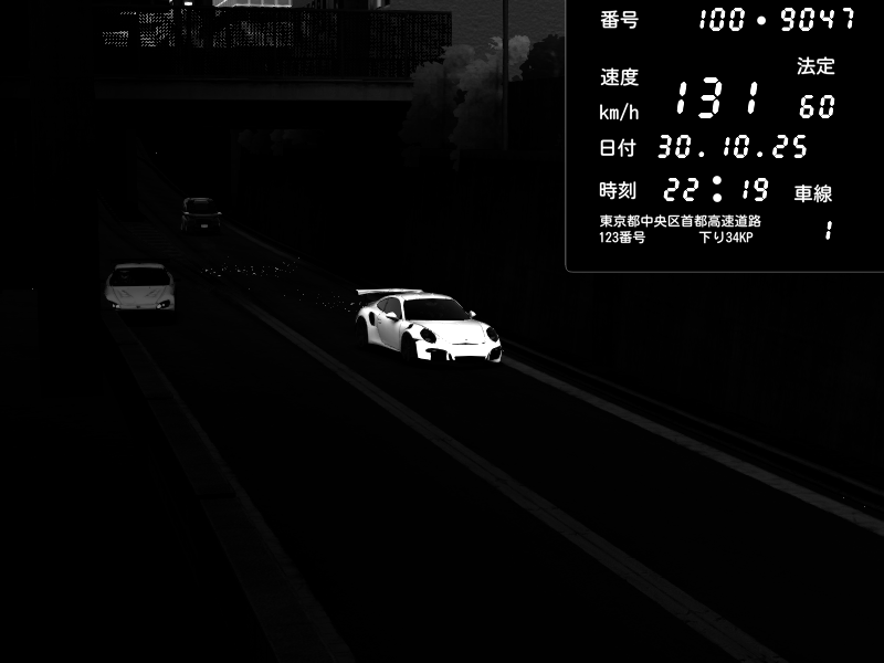 | 2025/10/30 22:19 | C1内回り 京橋 | 131 / 60 km/h | Porsche 911 GT3 RS | CAPTURE |