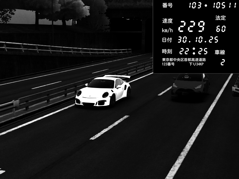 | 2025/10/30 22:25 | C1内回り 銀座 | 229 / 60 km/h | Porsche 911 GT3 RS | CAPTURE |