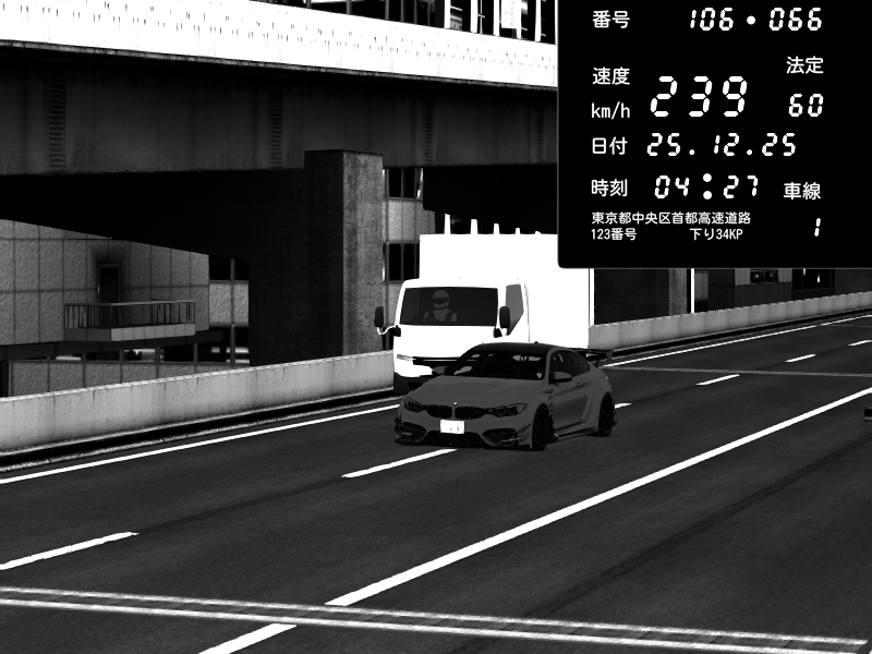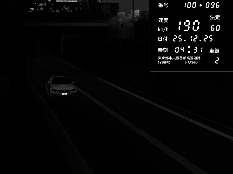 | 2025/12/25 04:25 | C1内回り 銀座 | 187 / 60 km/h | BMW M4 crash.Sp Varis Widebody | CAPTURE |