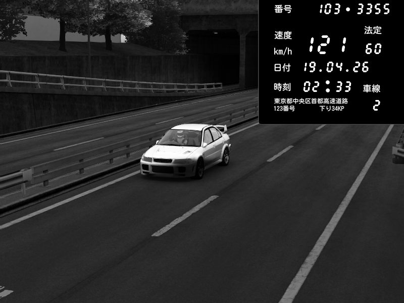 | 2026/04/19 02:33 | C1内回り 銀座 | 121 / 60 km/h | Mitsubishi Lancer Evolution V Wangan Spec | CAPTURE |
