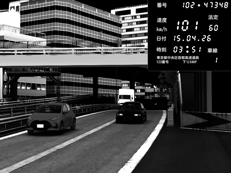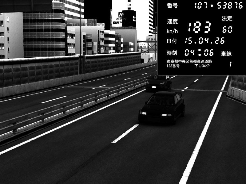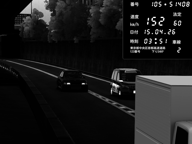 | 2026/04/15 04:05 | C1外回り 新富町 | 113 / 60 km/h | Mitsubishi Lancer Evolution V Wangan Spec | CAPTURE |