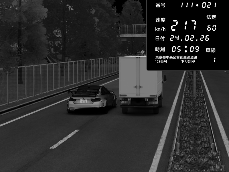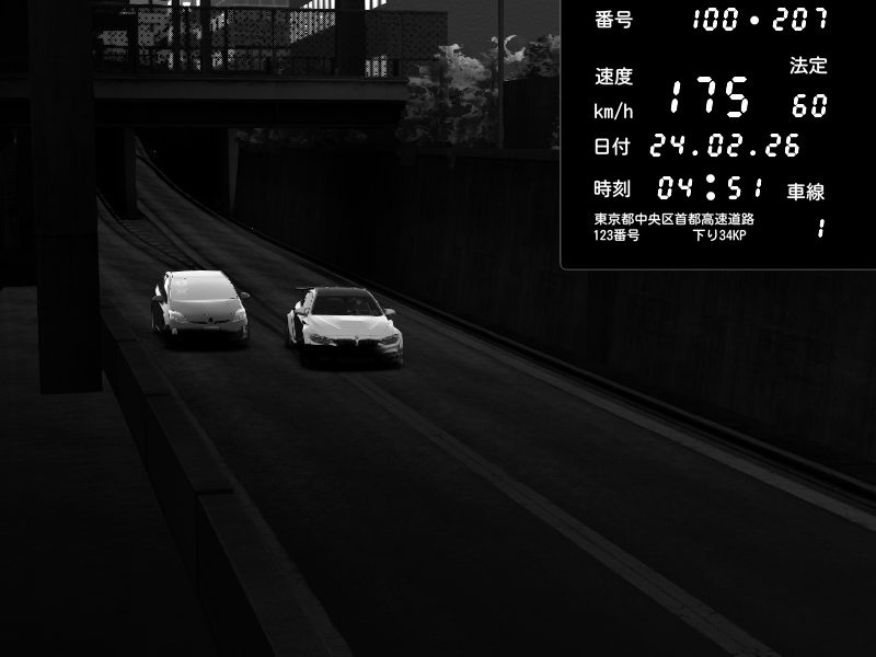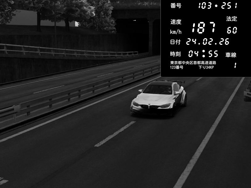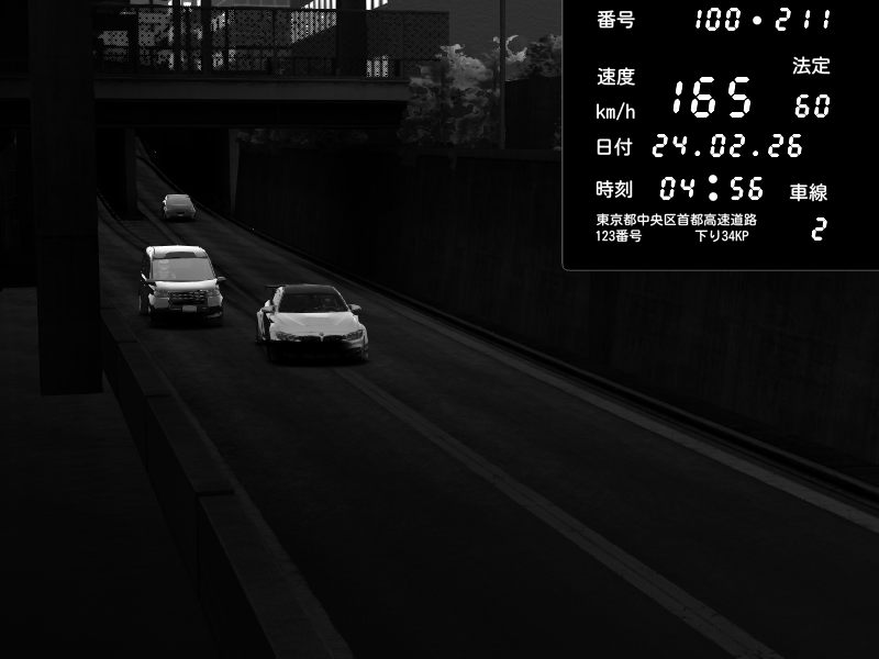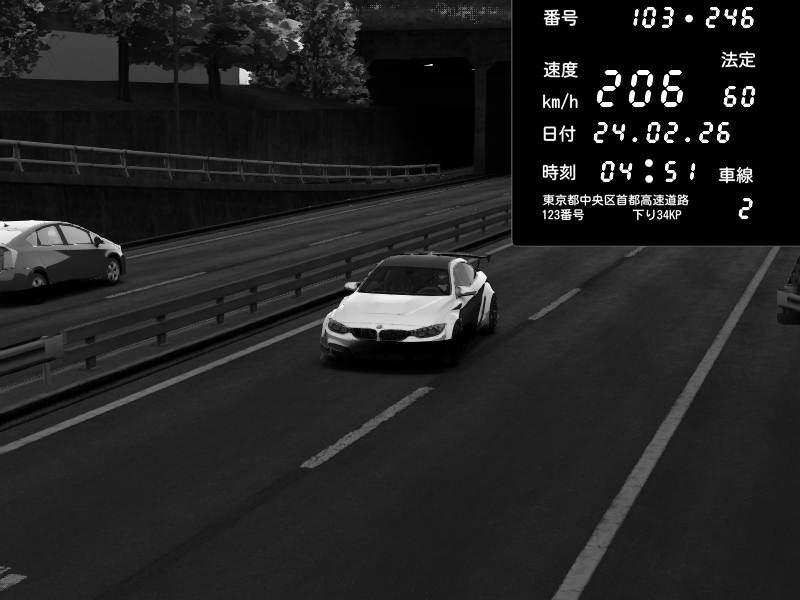 | 2026/02/24 04:51 | C1内回り 銀座 | 206 / 60 km/h | BMW M4 crash.Sp Varis Widebody | CAPTURE |