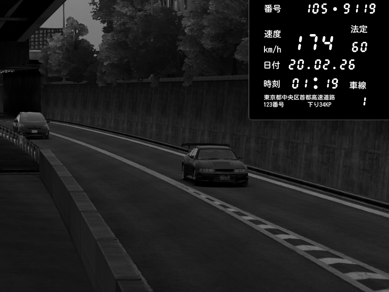 | 2026/02/20 01:19 | C1外回り 京橋 | 174 / 60 km/h | Nissan Skyline GTR R33 (S3 - Wangan) | CAPTURE |