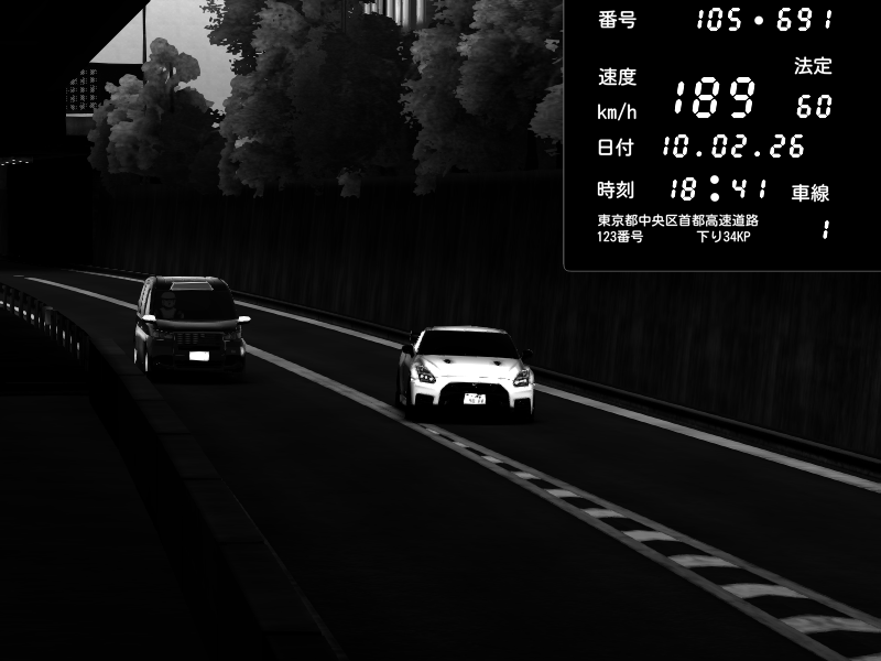 | 2026/02/10 18:41 | C1外回り 京橋 | 189 / 60 km/h | Nissan GT-R NISMO 2017 | CAPTURE |