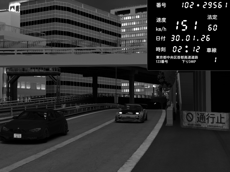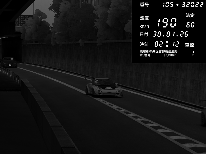 | 2026/01/30 02:12 | C1外回り 京橋 | 190 / 60 km/h | Mazda RX-7 FD3S FEED Afflux GT3 | CAPTURE |