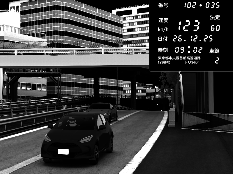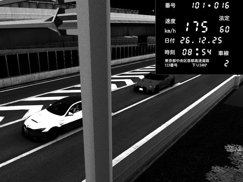 | 2025/12/26 08:54 | C1内回り 竹橋JCT | 175 / 60 km/h | Nissan GT-R NISMO 2017 | CAPTURE |