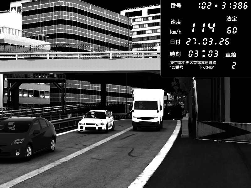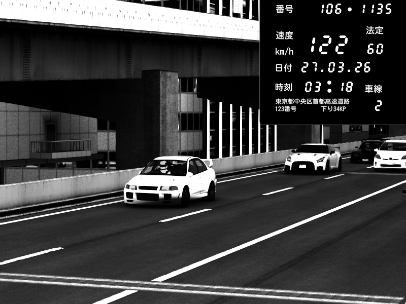 | 2026/03/27 03:03 | C1外回り 新富町 | 114 / 60 km/h | Mitsubishi Lancer Evolution V Wangan Spec | CAPTURE |