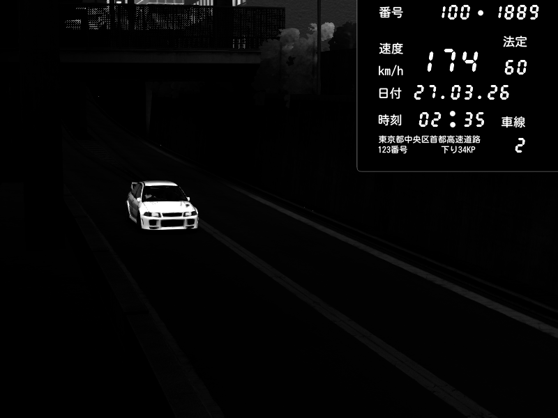 | 2026/03/27 02:37 | C1内回り 竹橋JCT | 157 / 60 km/h | Mitsubishi Lancer Evolution V Wangan Spec | CAPTURE |