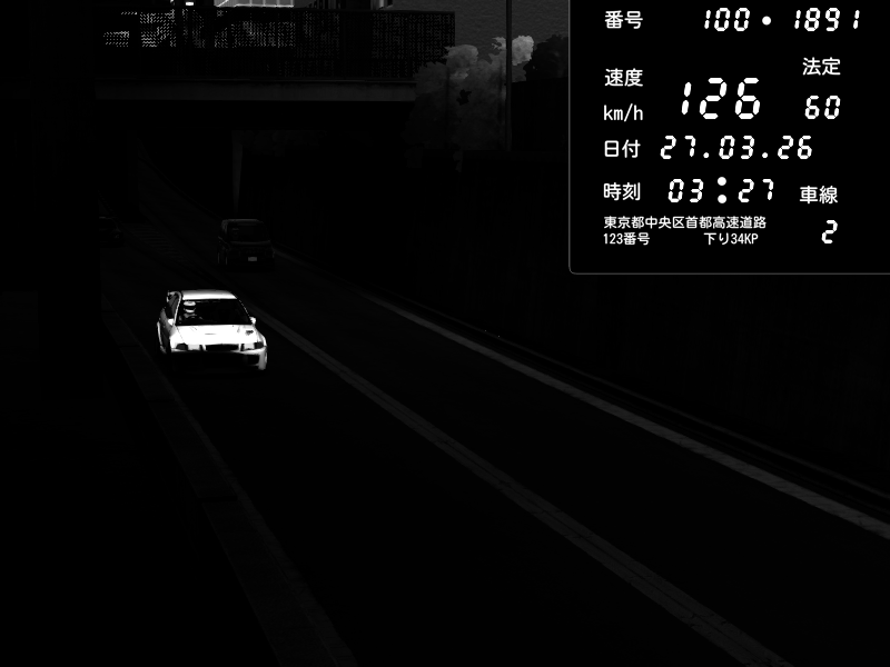 | 2026/03/27 03:09 | 4号下り 代々木 | 136 / 60 km/h | Mitsubishi Lancer Evolution V Wangan Spec | CAPTURE |