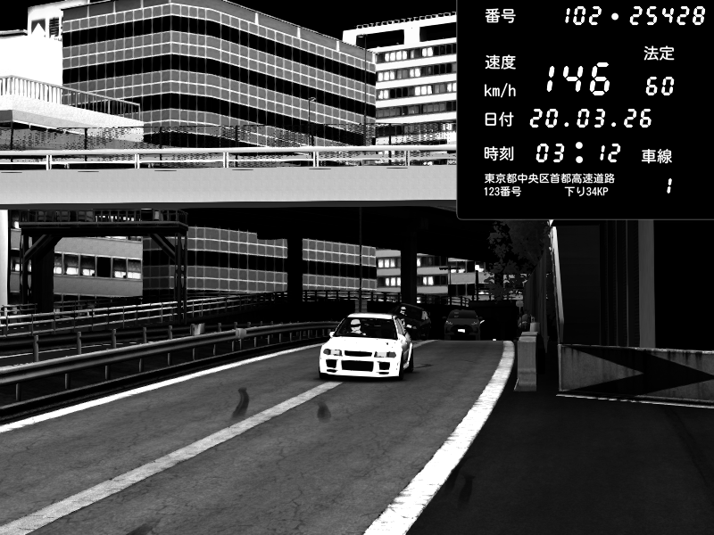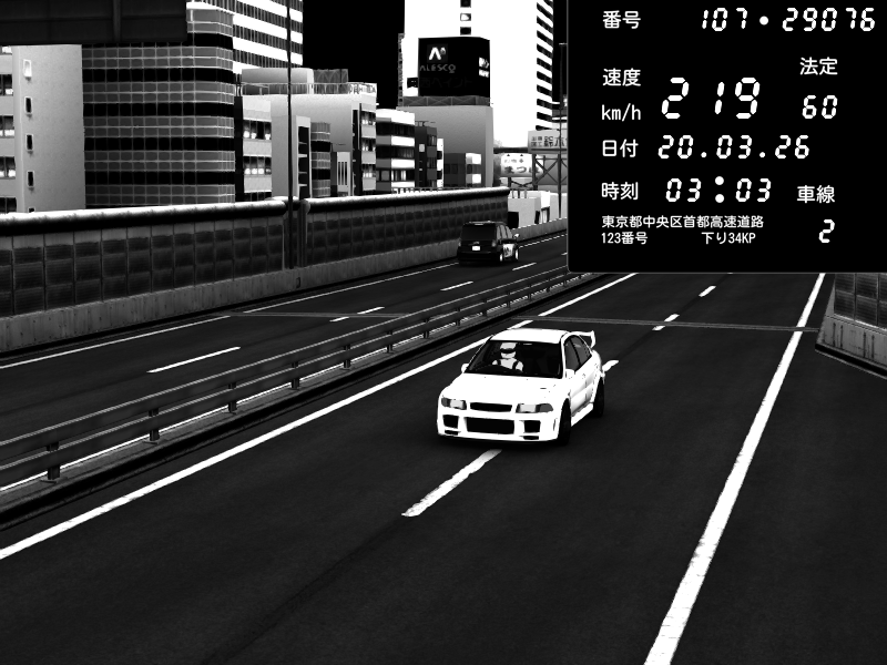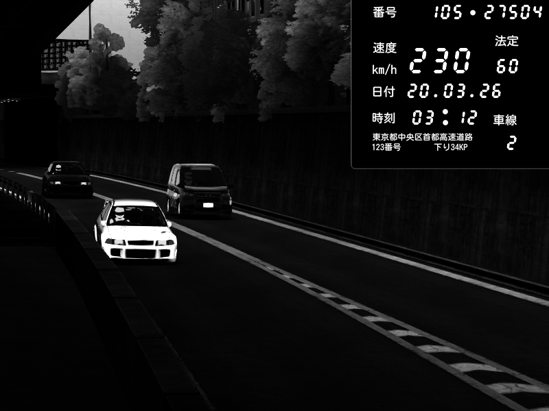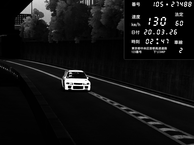 | 2026/03/20 03:12 | C1外回り 新富町 | 146 / 60 km/h | Mitsubishi Lancer Evolution V Wangan Spec | CAPTURE |