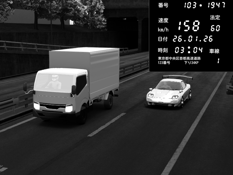 | 2026/01/26 03:04 | C1内回り 銀座 | 158 / 60 km/h | Mazda RX-7 FD3S RE Amemiya | CAPTURE |