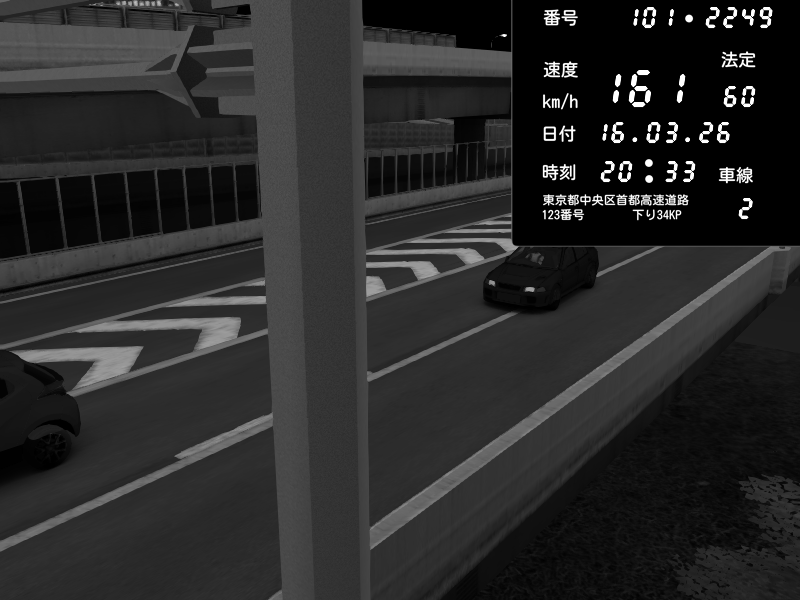 | 2026/03/16 20:33 | C1内回り 竹橋JCT | 161 / 60 km/h | Mitsubishi Lancer Evolution V Wangan Spec | CAPTURE |
