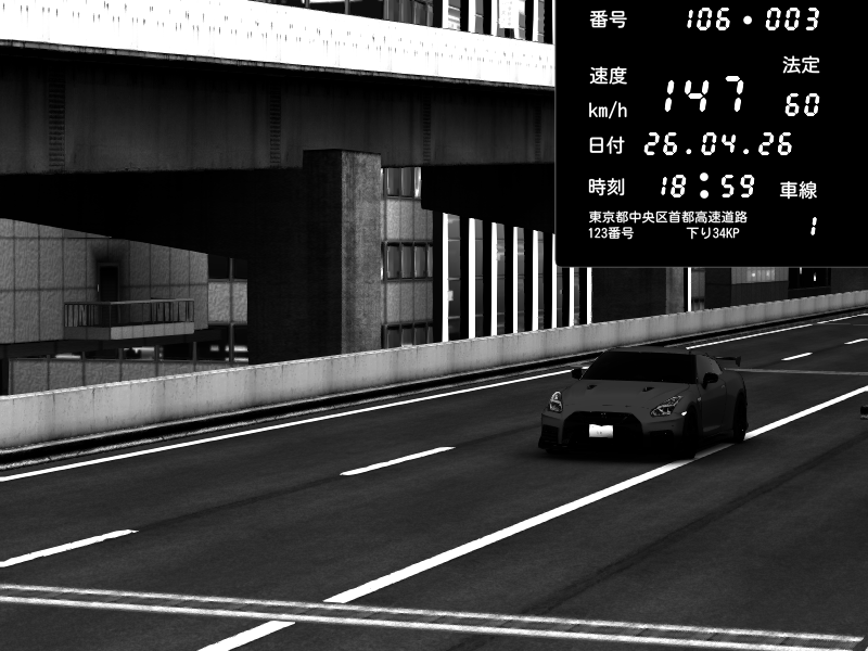 | 2026/04/26 18:34 | C1内回り 竹橋JCT | 156 / 60 km/h | Nissan GT-R NISMO 2017 | CAPTURE |