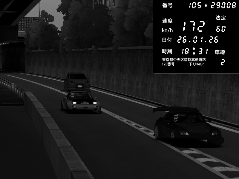 | 2026/01/26 18:31 | C1外回り 京橋 | 172 / 60 km/h | Mazda RX-7 FD3S FEED Afflux GT3 | CAPTURE |