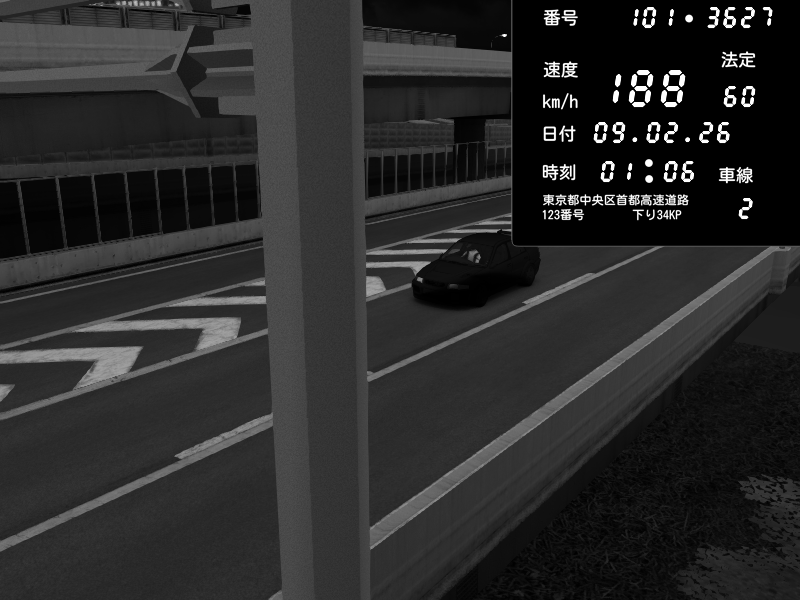 | 2026/02/09 01:06 | C1内回り 竹橋JCT | 188 / 60 km/h | Mitsubishi Lancer Evolution V Wangan Spec | CAPTURE |