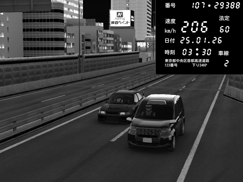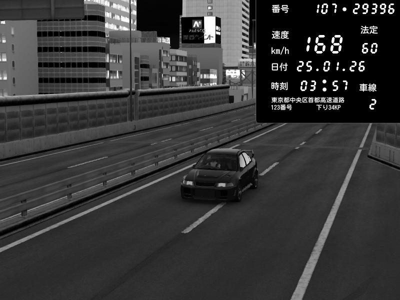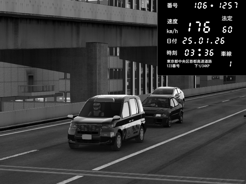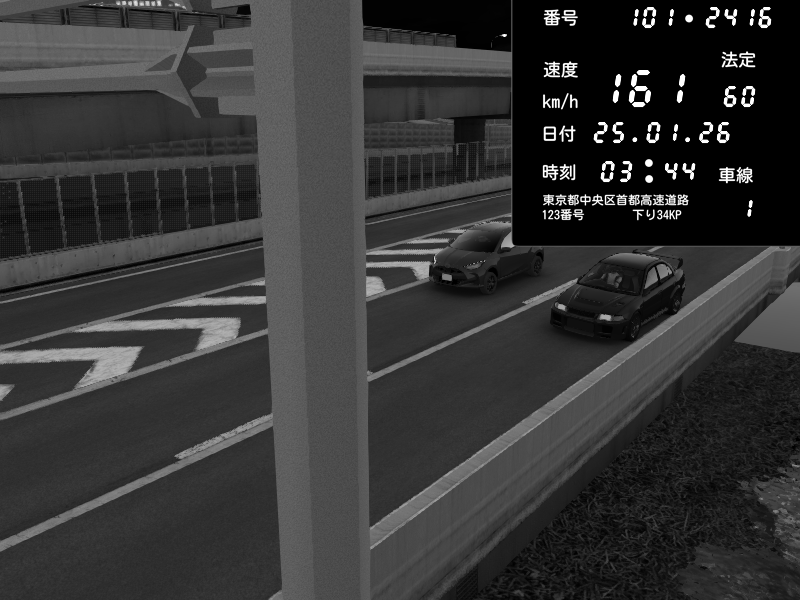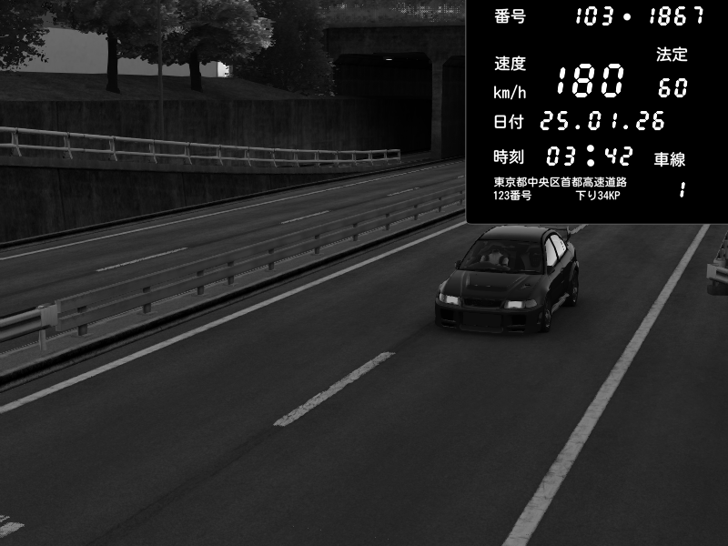 | 2026/01/25 03:42 | C1内回り 銀座 | 180 / 60 km/h | Mitsubishi Lancer Evolution V Wangan Spec | CAPTURE |