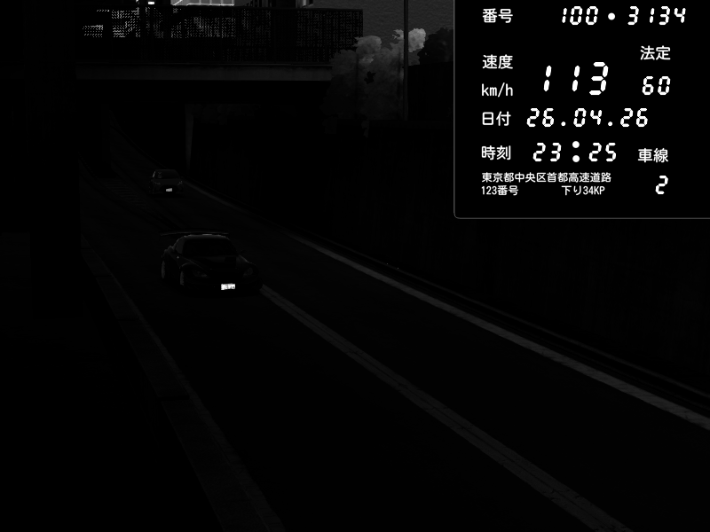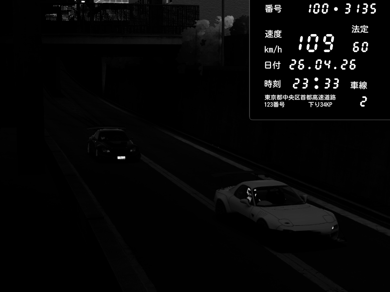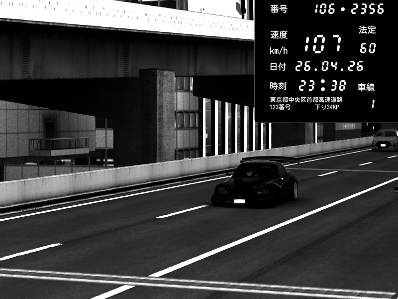 | 2026/04/26 23:33 | C1内回り 京橋 | 109 / 60 km/h | Honda S2000 Turbo GT1 Amuse (AP1) | CAPTURE |