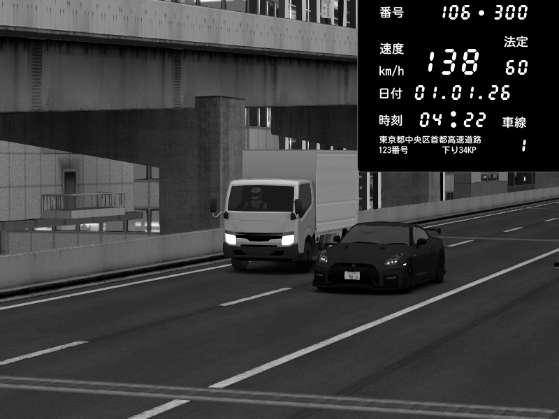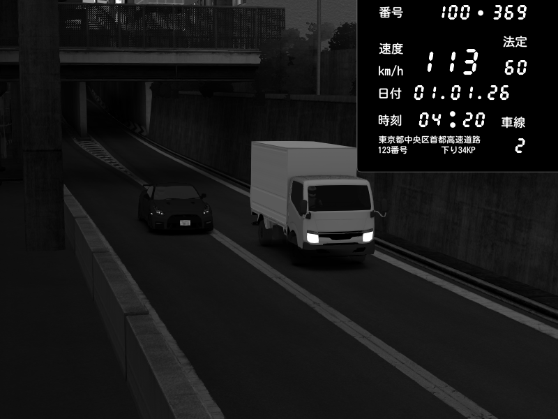 | 2026/01/01 03:24 | C1内回り 京橋 | 106 / 60 km/h | Nissan GT-R NISMO 2017 | CAPTURE |