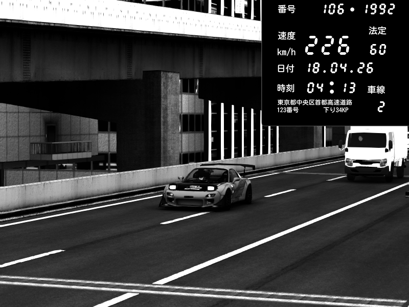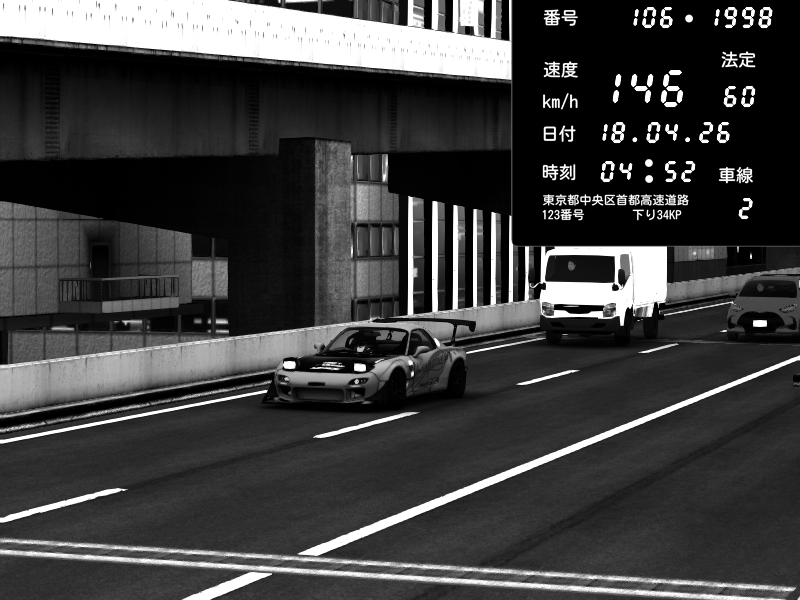 | 2026/04/18 04:34 | C1内回り 竹橋JCT | 128 / 60 km/h | Mazda RX-7 FD3S FEED Afflux GT3 | CAPTURE |