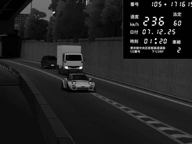 | 2025/12/07 01:20 | C1外回り 京橋 | 236 / 60 km/h | Mazda RX-7 FD3S FEED Afflux GT3 | CAPTURE |