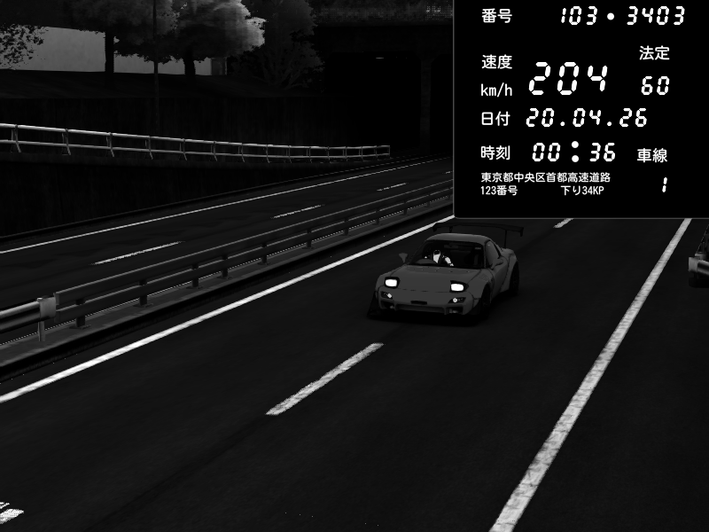| 2026/04/20 00:36 | C1内回り 銀座 | 204 / 60 km/h | Mazda RX-7 FD3S FEED Afflux GT3 | CAPTURE |