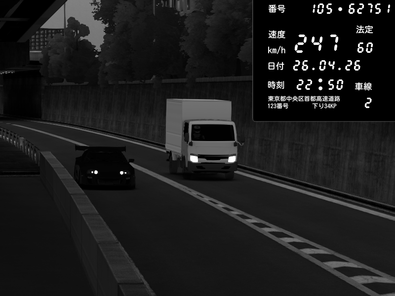 | 2026/04/26 22:55 | C1外回り 新富町 | 134 / 60 km/h | Toyota Supra MKIV Time Attack | CAPTURE |