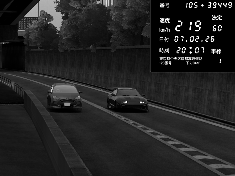 | 2026/02/07 20:10 | C1外回り 京橋 | 251 / 60 km/h | Toyota Supra MKIV Time Attack | CAPTURE |