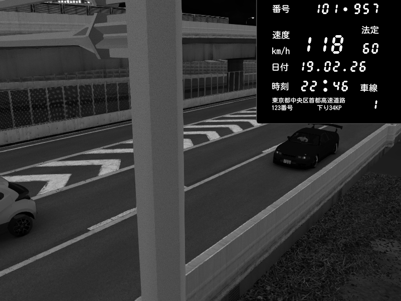 | 2026/02/19 22:46 | C1内回り 竹橋JCT | 118 / 60 km/h | Nissan Skyline GTR R33 (S3 - Wangan) | CAPTURE |