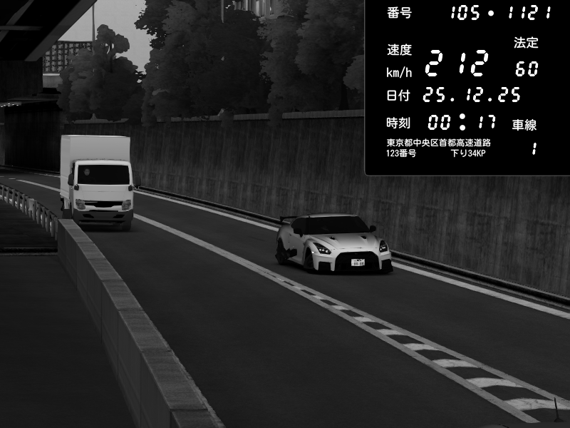| 2025/12/25 00:17 | C1外回り 京橋 | 212 / 60 km/h | Nissan GT-R NISMO 2017 | CAPTURE |