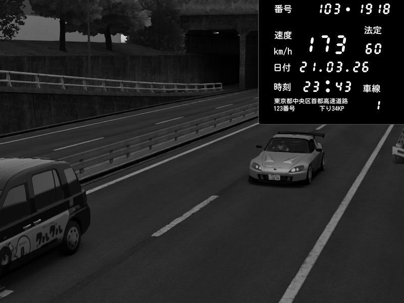 | 2026/03/21 23:43 | C1内回り 銀座 | 173 / 60 km/h | Honda S2000 (AP2 - Legendary) | CAPTURE |