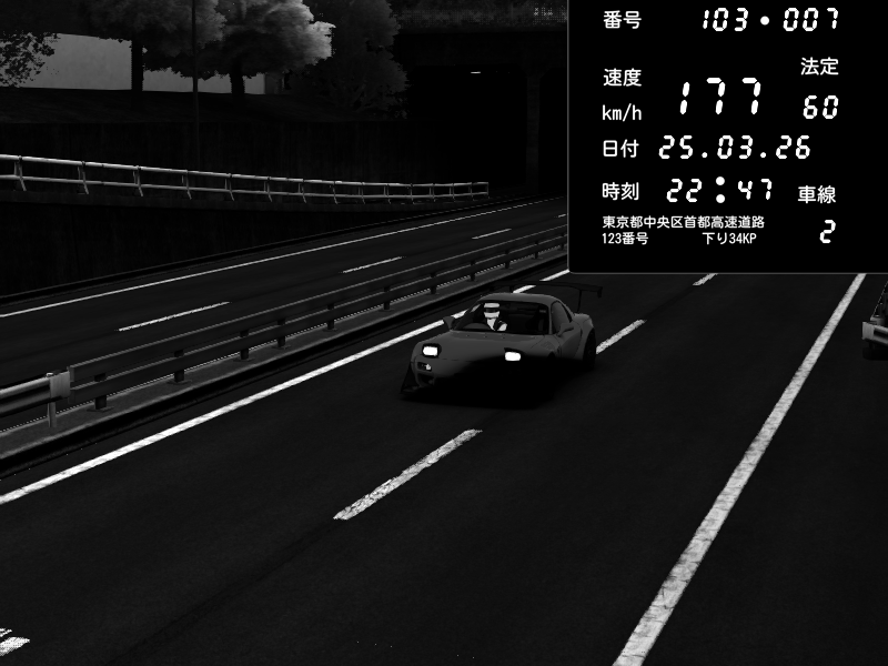 | 2026/03/25 22:47 | C1内回り 銀座 | 177 / 60 km/h | Mazda RX-7 FD3S FEED Afflux GT3 | CAPTURE |