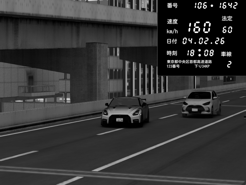 | 2026/02/04 18:08 | 9号下り 木場 | 160 / 60 km/h | Nissan GT-R NISMO 2017 | CAPTURE |
