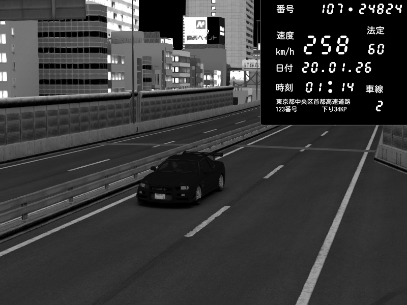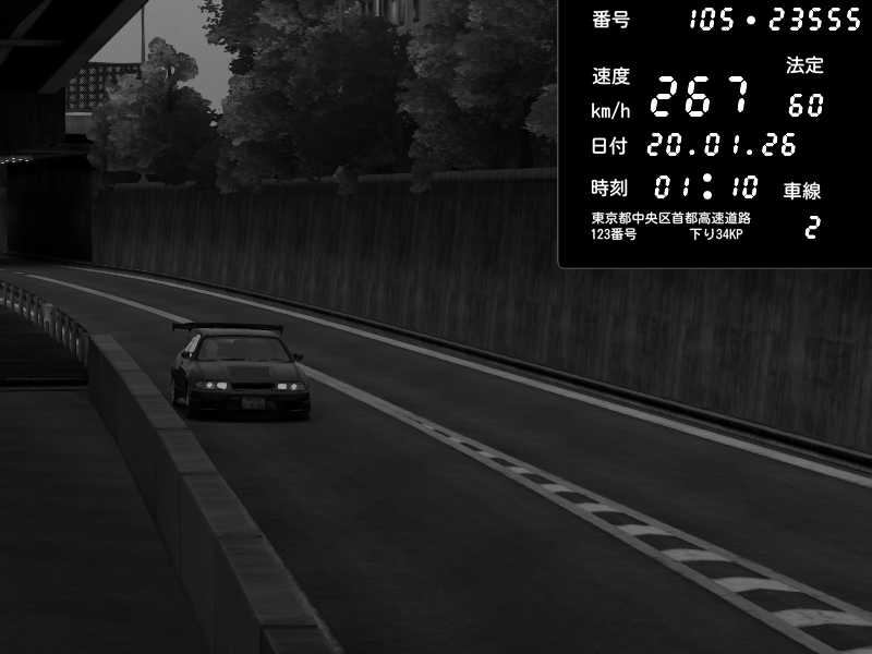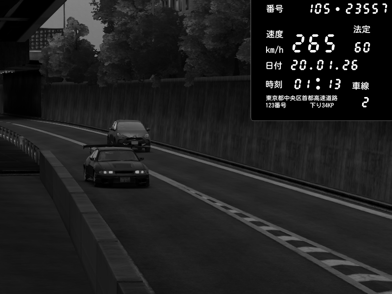 | 2026/01/19 04:34 | 4号下り 代々木 | 149 / 60 km/h | NIN79 | Nissan Skyline GTR R33 (S3 - Wangan) | CAPTURE |