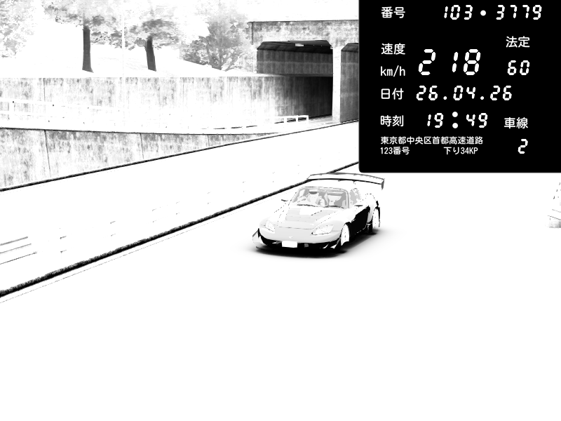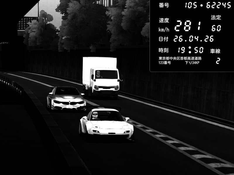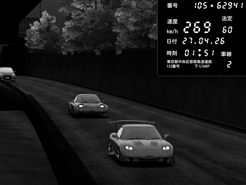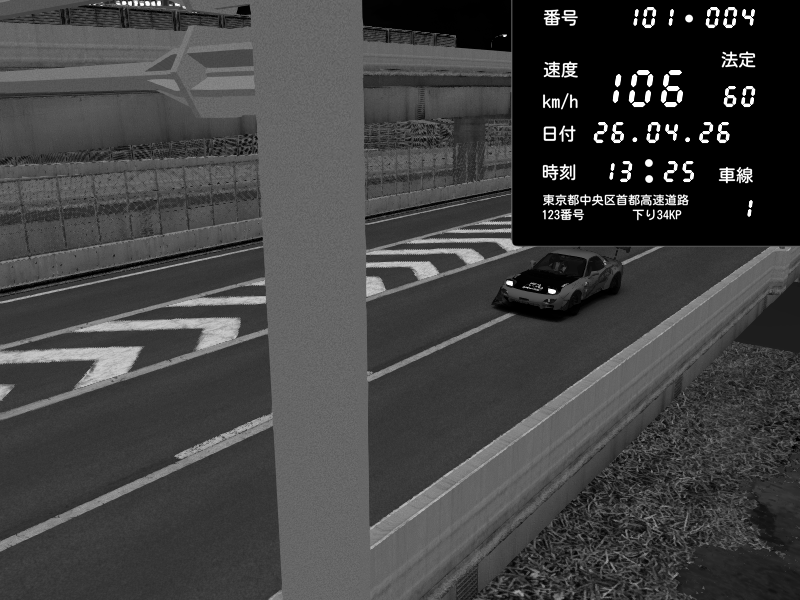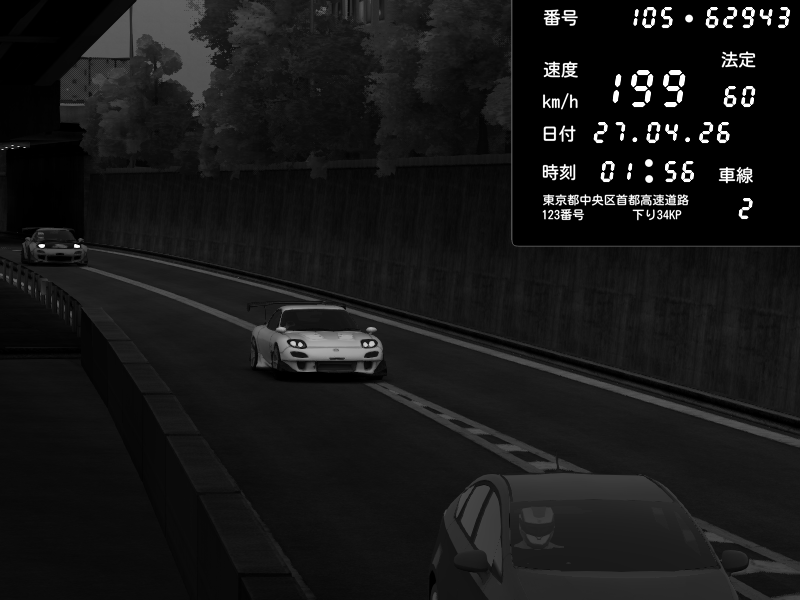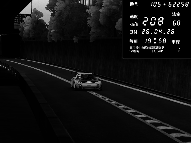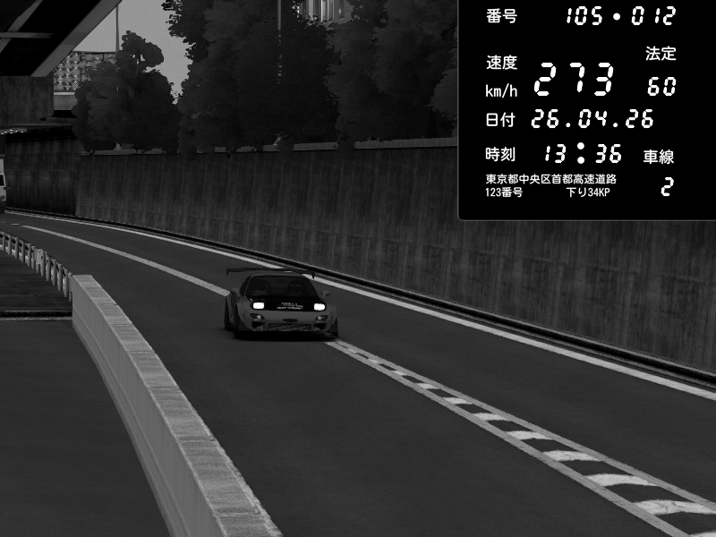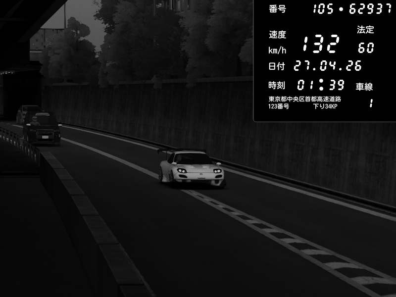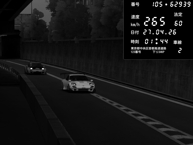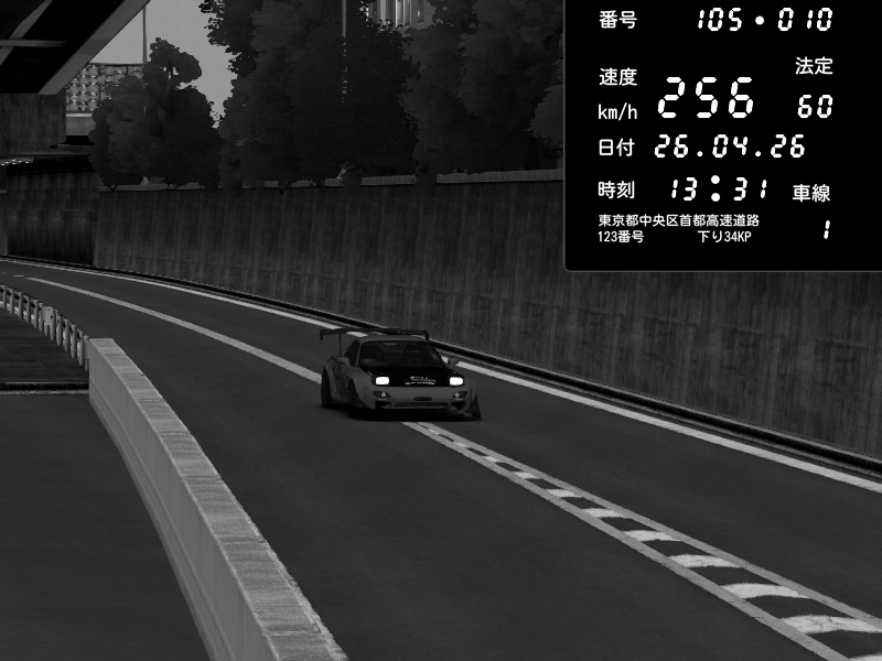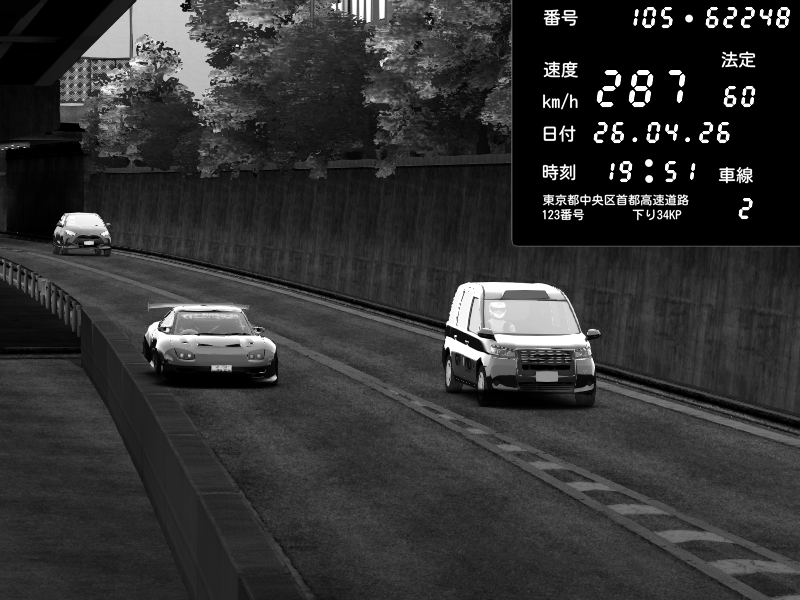 | 2026/04/26 13:17 | C1内回り 竹橋JCT | 100 / 60 km/h | Player | Mazda RX-7 FD3S FEED Afflux GT3 | CAPTURE |