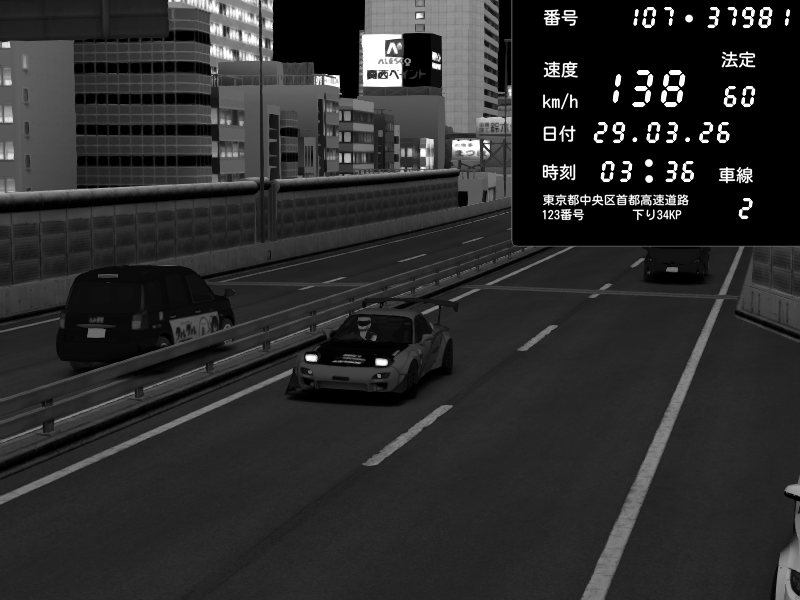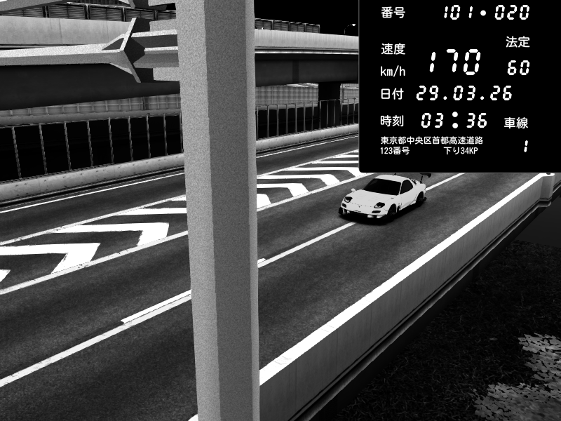 | 2026/03/29 03:36 | C1内回り 竹橋JCT | 170 / 60 km/h | Player | Mazda RX-7 FD3S RE Amemiya | CAPTURE |