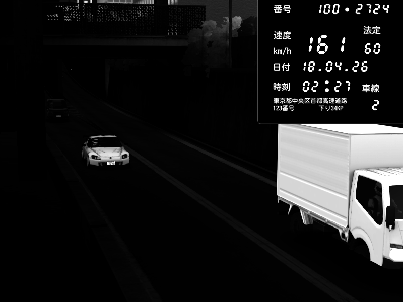 | 2026/04/18 02:28 | C1内回り 竹橋JCT | 142 / 60 km/h | 木曜が一番疲れている | Honda S2000 (AP2 - Legendary) | CAPTURE |