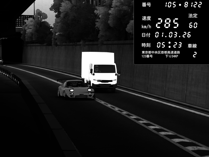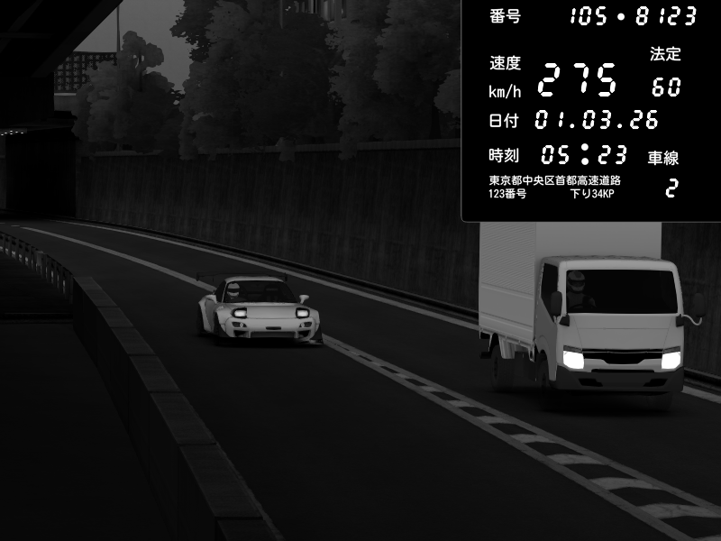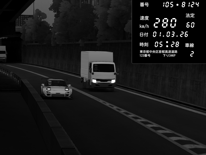 | 2026/03/01 05:28 | C1外回り 京橋 | 280 / 60 km/h | l67l | Mazda RX-7 FD3S FEED Afflux GT3 | CAPTURE |