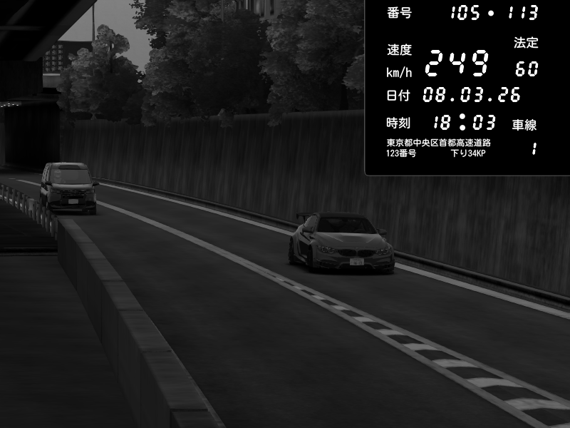 | 2026/03/08 18:04 | C1外回り 新富町 | 174 / 60 km/h | HENNESSY | BMW M4 crash.Sp Varis Widebody | CAPTURE |