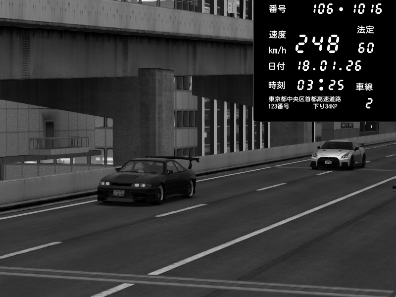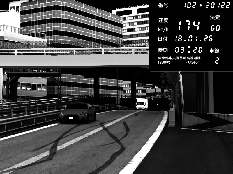 | 2026/01/18 03:11 | C1外回り 新富町 | 101 / 60 km/h | Sebastien Loubar | Nissan GT-R NISMO 2017 | CAPTURE |