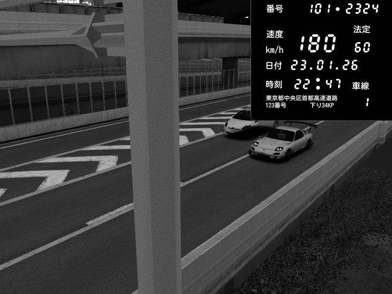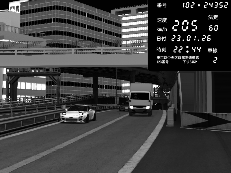 | 2026/01/23 22:47 | C1内回り 竹橋JCT | 180 / 60 km/h | Player | Mazda RX-7 FD3S RE Amemiya | CAPTURE |