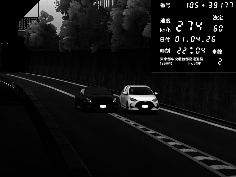 | 2026/04/01 22:04 | C1外回り 京橋 | 274 / 60 km/h | AMCRL | Nissan GT-R NISMO 2017 | CAPTURE |