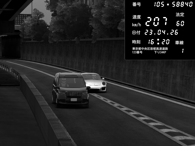 | 2026/04/23 16:20 | C1外回り 京橋 | 207 / 60 km/h | GODFREY | Porsche 911 GT3 RS | CAPTURE |